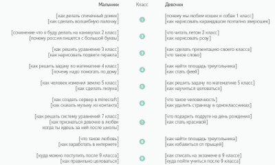 Ко Дню защиты детей Яндекс подсчитал поисковые запросы от пользователей младше 18 лет. Оказалось, что дети чаще составляют запросы в виде вопросов, чем взрослые, а девочки начинают интересоваться техникой поцелуев на четыре года раньше, чем мальчики.